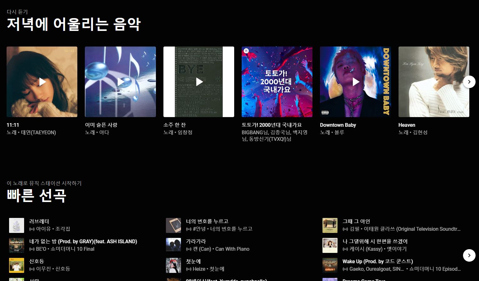 유튜브 뮤직에서는 즐겨 듣는 음악, 인기 음악 플레이리스트, 추억의 음악, 빠른 선곡, 맞춤 믹스, 한국 인기곡 차트, 기분 좋은 음악, 힐링 음악, 추억의 미니홈피 베스트 등 다양한 음원을 추천해주고 있습니다. 주로 듣는 한 장르만 추천해주는 게 아니라 다양한 음원을 추천해주고 있어서 다양하게 들어볼 수 있어서 저는 개인적으로 만족하고 있습니다.