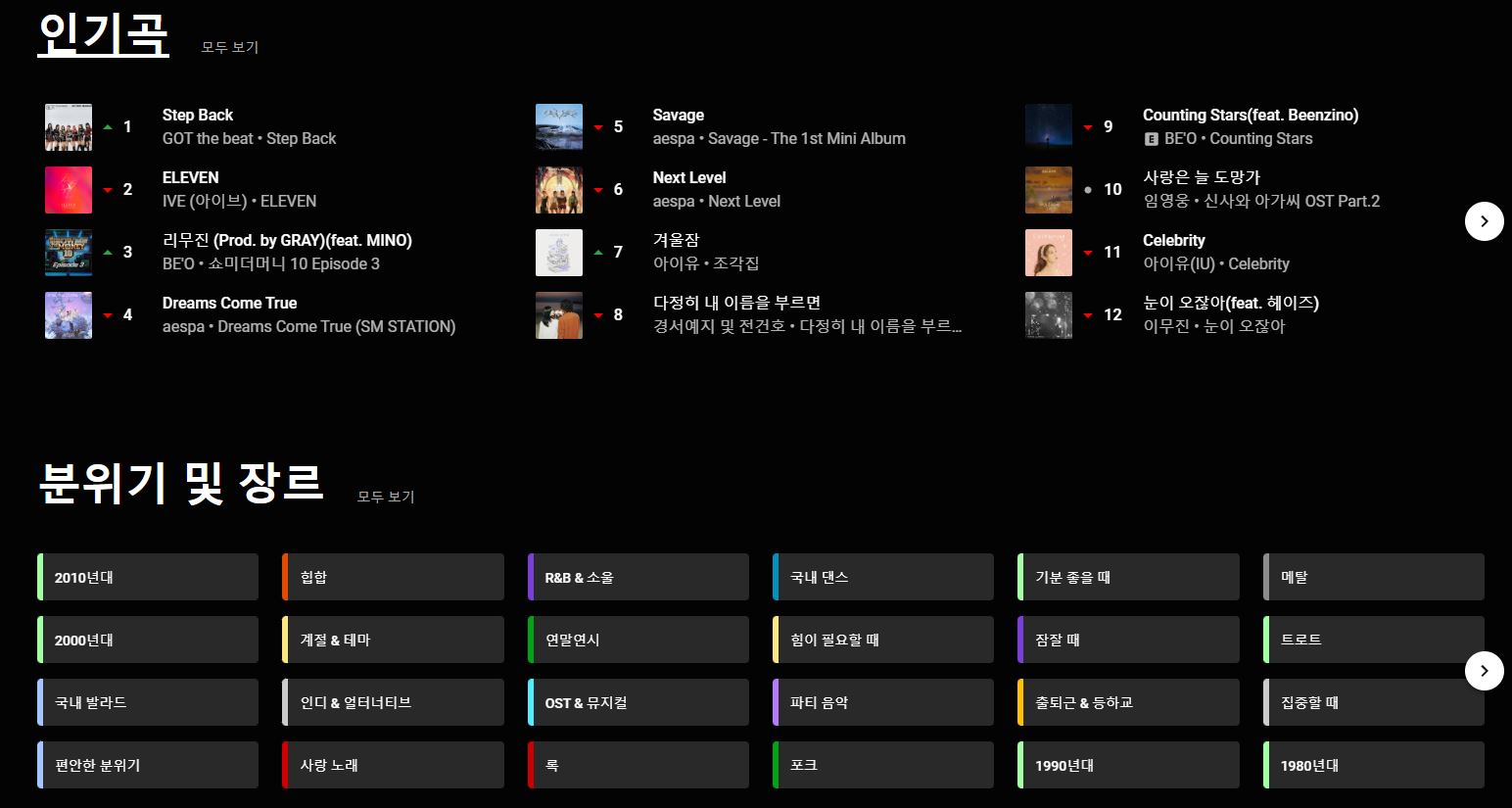 카테고리별 음원 분류가 잘 되어 있는 편이며, 인기 음악을 통해 사람들이 많이 듣는 음원을 들어볼 수도 있습니다. 저는 유튜브 뮤직 음질도 만족스럽게 듣고 있습니다.
