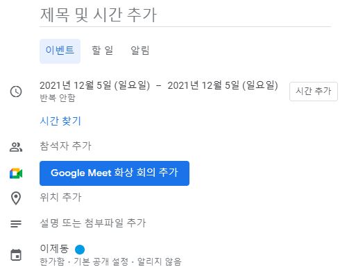 구글 캘린더를 통해 일정을 추가 하시고자 한다면, 달력의 빈 공간을 클릭합니다. 빈 공간을 클릭하면 위와 같은 일정 입력 화면이 팝업이 됩니다. 제목 및 시간을 추가하고 이벤트, 할 일, 알림 세 가지 중에서 일정의 성격을 선택하고 일자를 선택합니다. 시간을 추가하면 알림이 울리도록 할 수 있습니다. 필요한 경우 참석자를 추가할 수 있으며, 위치를 추가할 수도 있습니다. 기타 첨부파일을 추가할 수도 있고 모든 입력이 완료되면 저장하기 버튼을 클릭하면 일정이 저장됩니다.