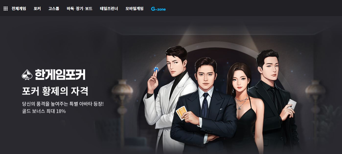 상단 메뉴를 통해 한게임에서 제공하고 있는 전체 게임 목록을 볼수 있습니다. 한게임에서는 포커와 고스톱 종류 이외에도 바둑, 장기, 보드게임 등 다양한 게임의 종류를 서비스하고 있습니다.